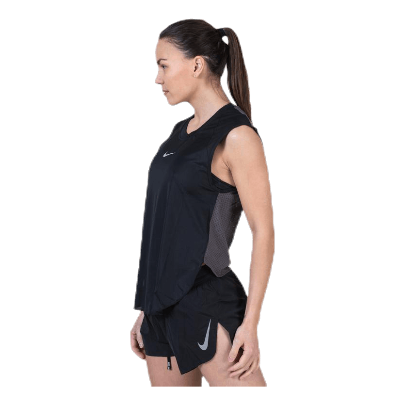 Nike Tank zagotavlja ultra prezračeno zmogljivost. Izjemno lahka tkanina je ogrnjena okoli vašega telesa, mrežasta plošča na hrbtni strani pa vas hladi, ko je tek vroč.